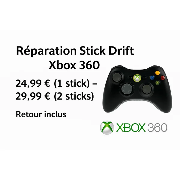 Réparation stick drift pour manette Xbox 360 – prix fixe 24,99 € pour 1 stick ou 29,99 € pour 2 sticks.